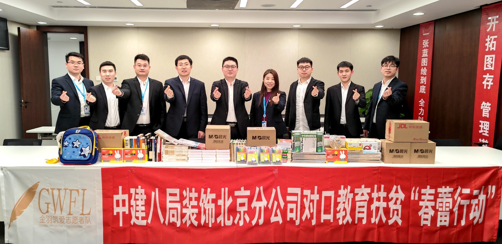 2022年4月至5月,参照《中建集团“建证未来”青年志愿服务行动方案》,八局装饰北京分公司以党建促团建,以党总支和团委为载体,秉承“奉献、友爱、互助、进步”的志愿精神,特开展“建证未来&金羽筑爱”特色教育扶贫春蕾行动。本次助学对象为2021年建立定点帮扶关系的“贵州省贵阳市南明区后巢乡关田巷1号宏宇希望小学”。
