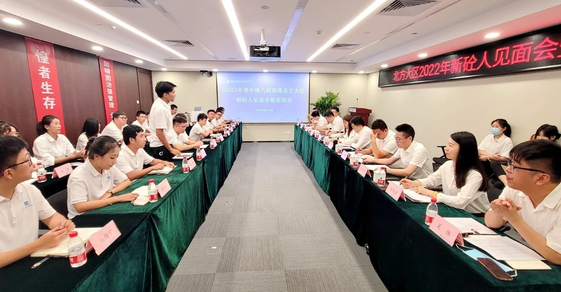会上,王钦霖首先代表公司和北方大区对新员工的到来表示热烈欢迎,并简要介绍了北方大区及所属单位概况。随后,2022年新员工对各自家乡、毕业院校、所学专业、才艺特长以及职业规划等,作了细致洋溢的介绍,表达了对加入八局装饰的激动和对岗位建功的期许。在座谈交流环节,新砼人从岗位专业选择、职业成长路径和培训提升渠道等方面热情问询,各分公司代表结合工作感悟和成长经历,从立德树人、廉洁从业、敬业坚守、担当尽责、职业规划、自我提升等方面,将工作经验和成长智慧倾囊相授,衷心祝愿新员工在未来奋楫当先、青春有为。