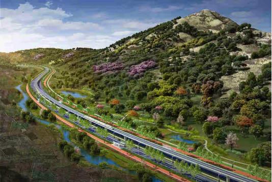 山前大道位于石家庄市鹿泉区西部山前区域,于2019年5月通车运行。该工程由中建二局河北分公司施工建设,北起石闫公路,南至青龙山大道,全长约50公里,按照全线双向六车道、重点路段双向八车道,国家一级公路的标准进行设计,道路中央设八米宽分隔绿化带,两侧设置50至100米不等的景观绿化带。